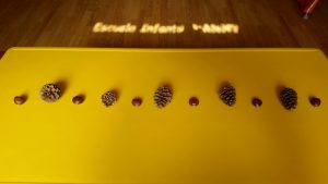 Aprovechando el otoño y los elementos con los que hemos estado tratando, proponemos a los niños otras actividades como realizar seriaciones a los alumnos de dos años, castaña-piña castaña-piña castaña-piña … así intentamos de manera lúdica que se inicien en la creación de seriaciones.